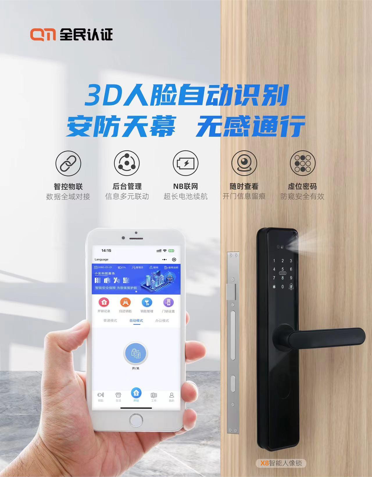 “全民认证3D人脸智能锁通过检测跟踪人体面部特征实现2秒内快速开门,轻松解决老年人容易遗忘问题。子女还可通过微信小程序进行安全、便捷的智能门锁管理,一键实现手机开锁、设备管理等应用功能,更安心、更放心。”