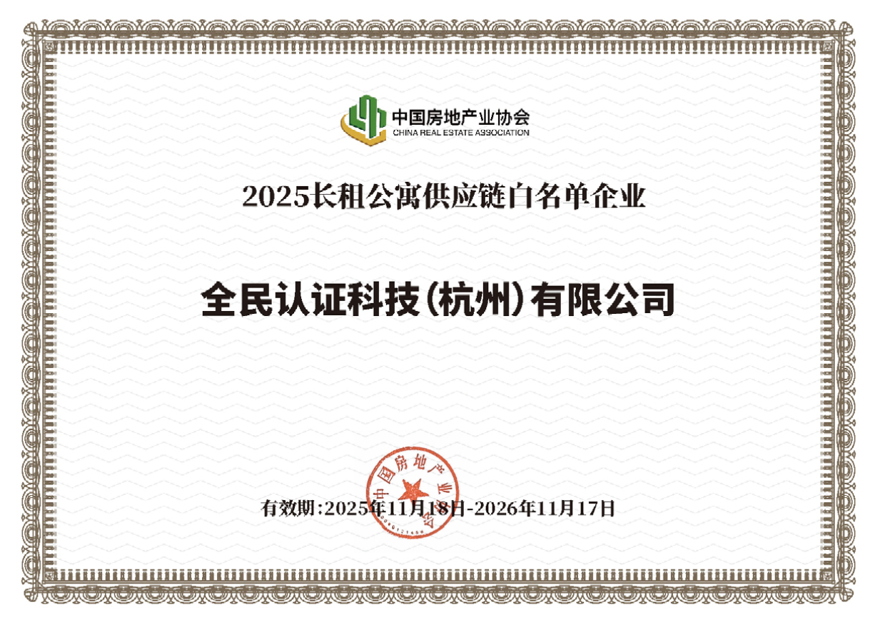 《2025长租公寓供应链白名单》旨在通过树立行业标杆,构建安全、稳定、透明的供应链生态。全民认证凭借其以数字身份认证与识别技术为核心、“芯端云网”软硬一体化的产品体系,以及覆盖北京、福建、新疆、云南、广西等地的多个大型租赁住房项目建设经验,获得了评委会的认可。